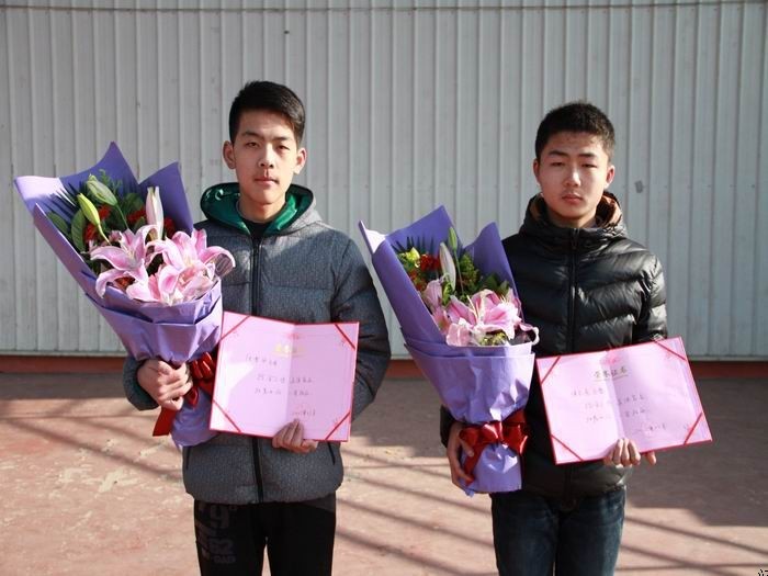讲话结束后,校长李直斌、党委副书记许晓江分别为两位同学颁发荣誉证书和鲜花。