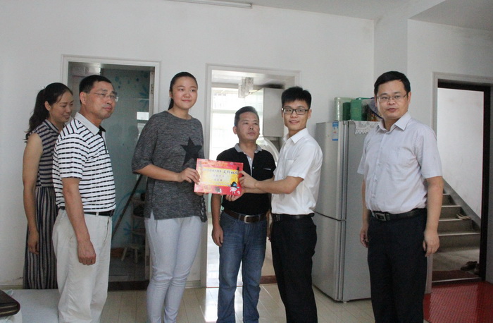 7月1日下午,在建党95周年这个喜庆的日子,中国建设银行泾县支行行长李松一行在188金宝博唯一官网_wap.sports918.com党委副书记许晓江的陪同下,看望慰问了今年高考宣城市文科状元、188金宝博唯一官网_wap.sports918.com优秀学子胡孟璠同学,送去了对莘莘学子的祝福和厚望,并送上爱心奖学金。