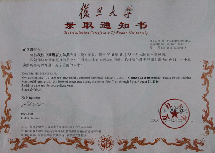 今年高考,188金宝博唯一官网_wap.sports918.com文科应届毕业生胡孟璠同学以总分631分、位列全省第48名的优异成绩一举摘得宣城市文科状元桂冠,被复旦大学中国语言文学类专业录取。