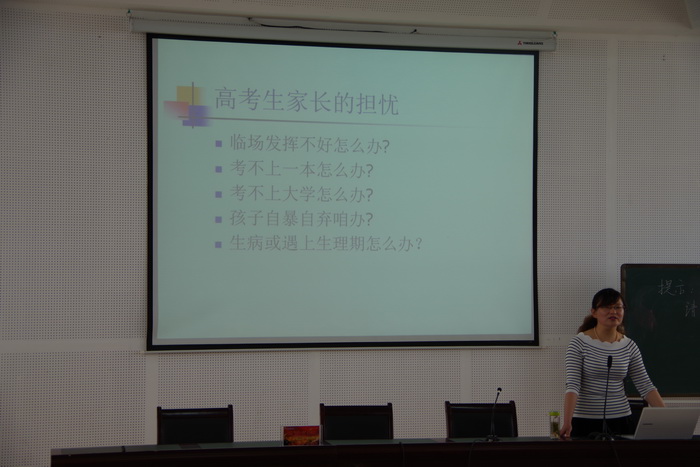 会议分两阶段进行。第一阶段家长会,由副校长、高三年级组主任佘超俊主持,校党委书记、校长王永生,校党委委员、校长助理杨银宝,校党委委员、校办公室主任出席会议。会上,佘校长代表学校和高三年级对家长们的到来表示了衷心的感谢,对召开本次会议的意义作了阐述。本次家长会还邀请到了安徽工程大学心理学教授、硕士生导师金艾裙给全体家长做了题为《言语兴奋剂为高考加分》的专题报告。金教授以一位母亲和曾经的高三家长的身份和与会家长作了经验分享和交流,她从自己对高考的理解到高考冲刺最后阶段所有家长应该如何具备积极良好的心理谈起,深入剖析了高三家长的心理,揭示了家庭教育的几个误区,给与会家长提出了合理和诚恳的建议。金教授的讲座案例详实、语言通俗、条理清晰,获得了家长们的一致认可。第一阶段家长会部分班级在阶梯教室听取报告,其他班级家长在班级通过多媒体同步收看了视频直播。