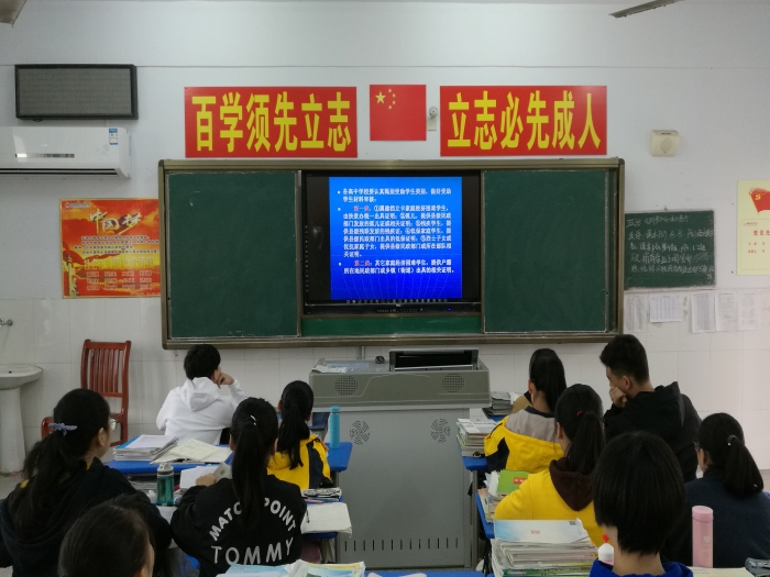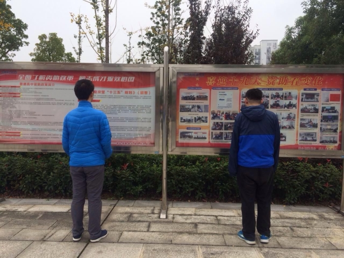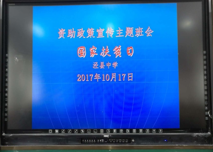 各班利用班会课,向学生们积极宣传国家各项资助政策,尤其是建档立卡等家庭经济贫困学生资助政策;晚自习前举行了广播讲话,对全体师生发出倡议:扶贫没有旁观者,你我都是践行人。我们都应关注贫困问题,关爱贫困人口,关心扶贫工作,鼓励同学们“躬身赴实践,笃行觅真知”,用自己的微薄之力去为扶贫工作做出贡献;通过宣传栏进行《教育脱贫攻坚“十三五”规划》的政策解读;通过电子显示屏,滚动显示 “2017,邀您一起”“教育扶贫促成才,携手共筑强校梦”、“落实扶贫政策,关注贫困学子”等标语进行广泛的宣传。