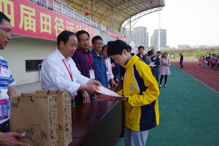闭幕式上,本次大赛总裁判长刘忠平宣布了甲、乙两组团体前八名班级名单、破纪录同学名单和获得道德风尚奖班级名单。学校领导为获奖的班级和个人一一颁奖。