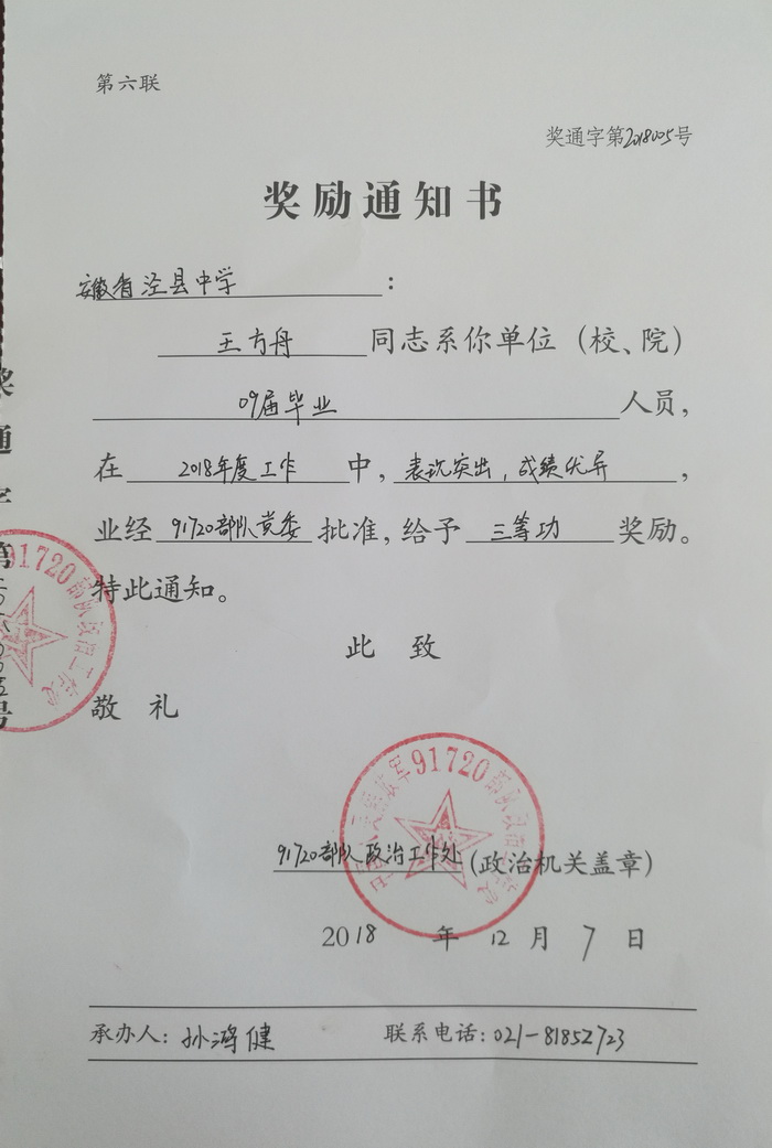 日前,从91720部队传来喜讯,188金宝博唯一官网_wap.sports918.com2009届(2)班优秀毕业生王方舟同学,在部队期间,表现优异,成绩突出,2018年度荣获三等功奖励。