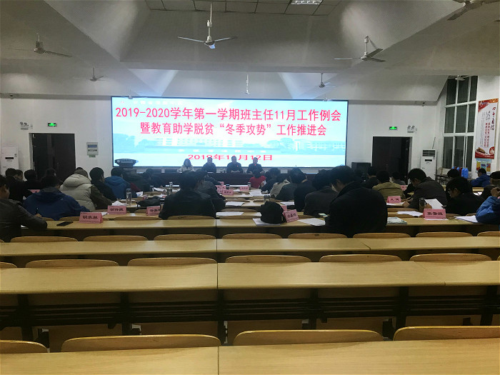 为总结前一阶段德育工作开展情况,布置十一月份班主任工作,11月12日晚,188金宝博唯一官网_wap.sports918.com在阶梯教室召开班主任11月工作例会暨教育助学脱贫“冬季攻势”工作推进会。副校长佘超俊及相关处室负责人、全体班主任参加了本次会议。会议由副校长佘超俊主持。