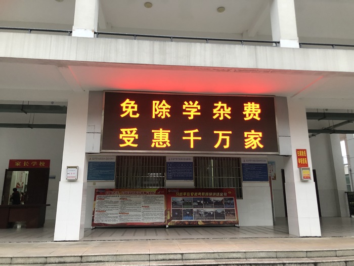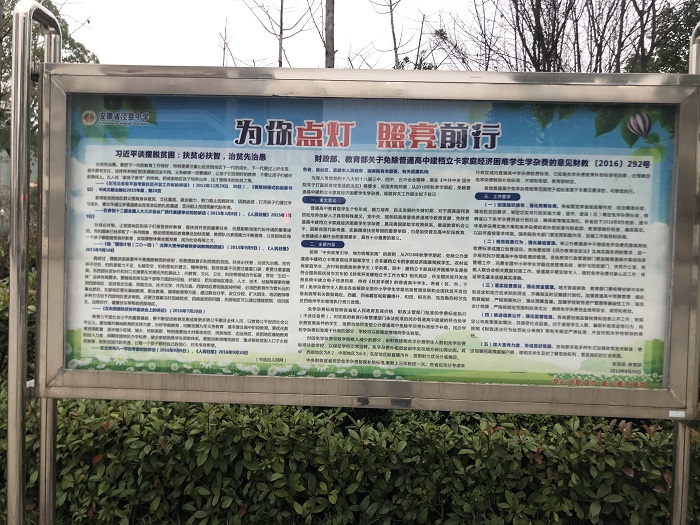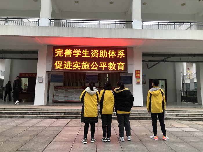 屏幕标语分别为:实施教育民生工程,共享教育发展成果;完善学生资助体系 促进实施公平教育;免除学杂费 受惠千万家。诚信承诺书中,受资助学生须作出以下承诺:所提供的家庭经济困难情况介绍及所填写的家庭收入等信息真实可信,无弄虚作假行为;严格遵守班级民主评议程序;所获助学金全部用于本人学习和生活之必需,不铺张浪费,不进行与自己经济情况不符的消费活动;热心公益事业,积极参加集体活动;谨守勤俭求学的原则,在学习、生活等方面发挥积极的模范作用,保证不违反学校的规章制度;自觉接受监督,如出现不诚信行为,退回资助金并接受纪律处分。
