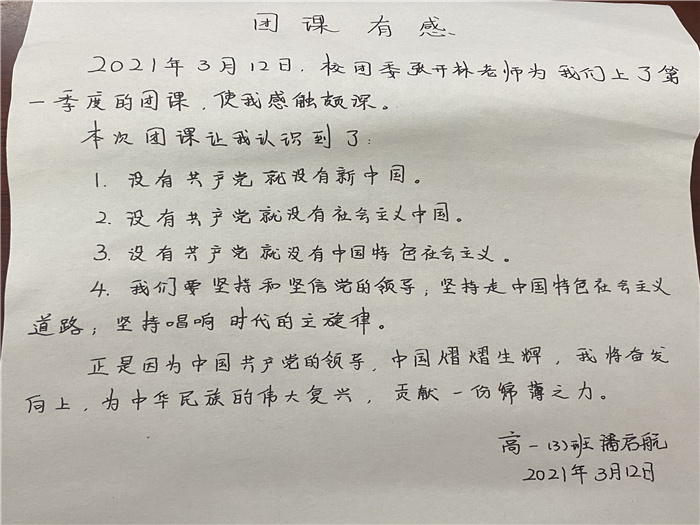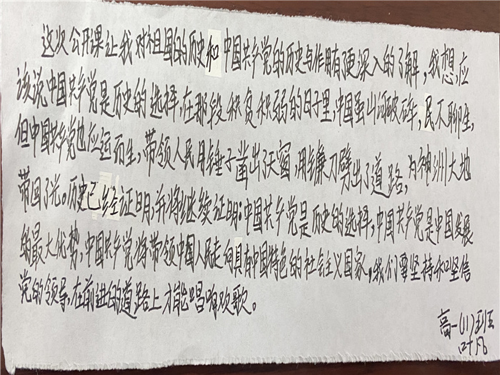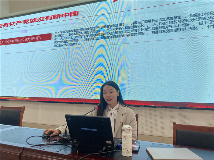 张老师制作了精美的团课课件,收集了大量视频及图片,她在团课中和同学们分享了中国共产党建立的历史意义,和大家一起探讨为什么说“没有共产党就没有新中国”、“没有共产党就没有社会主义中国”、“没有共产党就没有中国特色社会主义”。张老师总结到,党的百年光辉历程带给我们的深刻启示:一是坚持和坚信党的领导,二是坚持走中国特色社会主义道路,三是坚持唱响时代主旋律。