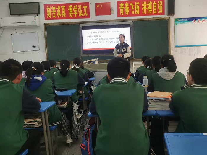 校资助中心精心制作资助政策宣传PPT,各班级认真组织学生学习了解普通高中学生资助政策。主题班会上,同学们了解到:目前,我国已建立起以政府为主导,社会力量积极参与的普通高中家庭经济困难学生资助政策体系。对家庭经济困难学生认定工作的依据、程序以及国家助学金评议的过程及档次等情况也有了进一步的了解。