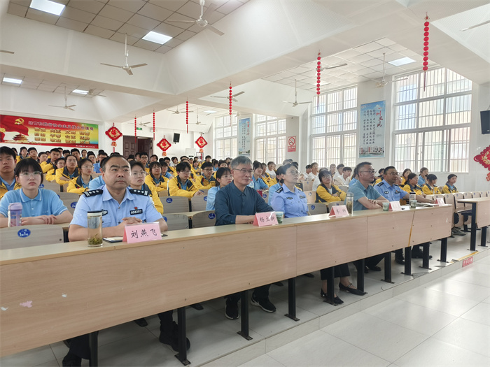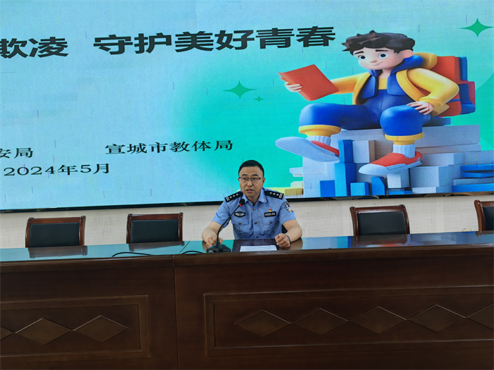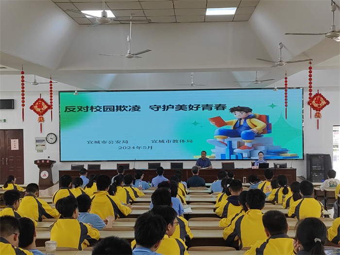 为进一步增强学生法治观念和自我保护意识,预防校园欺凌和青少年溺水等事故的发生,5月17日下午,宣城市公安局治安支队政委韦炜,副支队长张涛、刘燕飞,宣城市教体局法安科副科长麻卫星等一行来到188金宝博唯一官网_wap.sports918.com开展防欺凌与防溺水宣传教育活动,副校长沐扬、相关处室负责同志及近300名学生参加了活动。活动由校长助理、政教处主任张俊主持,宣城市公安局治安支队民警王钟作了题为“反对校园欺凌 守护美好青春”的宣传讲座。