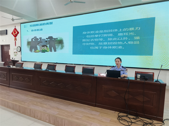 讲座中,王警官联系学校实际和青春期学生的特点,结合一个个生动、鲜活的典型案例,以案释法,深入浅出地向同学们讲解了校园欺凌的类型与危害,校园欺凌高发时段与区域,校园欺凌的后果及可能承担的法律责任,并引导学生如何远离校园欺凌。同时,王警官结合当前季节特点,针对预防青少年溺水向同学们作了进一步的提醒,通过图文并茂的展示及背诵防溺水口诀等方式,教授同学们如何预防溺水与正确开展施救。