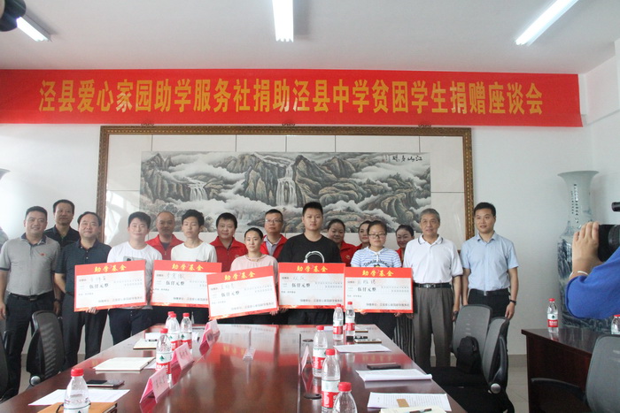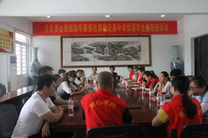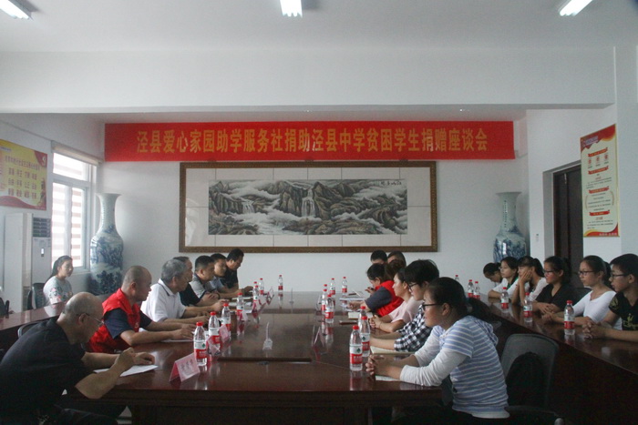 8月15日上午,泾县爱心家园助学服务社捐助泾县中学贫困学生捐赠座谈会在188金宝博唯一官网_wap.sports918.com综合南楼四楼会议室举行。县人大常委会副主任、校长王永生,县关工委主任桂祖乙,县委组织部常务副部长吴治国,团县委副书记彭浩,爱心家园助学服务社李勇等部分代表及188金宝博唯一官网_wap.sports918.com十余名受助学生和教师代表参加座谈会。座谈会由188金宝博唯一官网_wap.sports918.com副校长佘超俊主持。