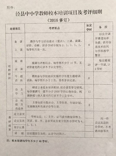 2016年安徽省教师资格定期注册制度正式全面启动,五年一注册,其中继续教育是重要指标之一。每一年的继续教育包括远程培训(24学时)和校本培训项目(48学时)及其他培训,五年不少于360学时。从今年开始校本培训考评细则发生了很大变化,根据上级主管部门的解读,现对《校本研训记录册》的填写作以下说明: