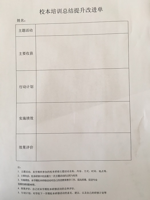 5、“总结提升改进单”项目:新增加,表格已经放到每位教师办公桌上,请填写后粘贴的记录册的后面。