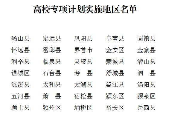 高校专项计划招生学校为教育部直属高校和其他自主招生试点高校。我省高校专项计划实施区域为我省列入国家集中连片特殊困难县、国家级扶贫开发重点县、省扶贫开发工作重点县(市、区)和省扶贫开发连片地区县(市、区)(共35个)。具体名单如下: