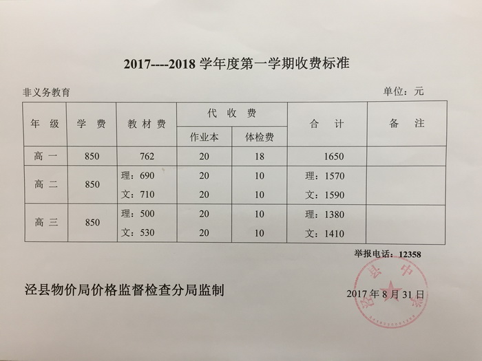 泾县中学2017-2018学年度第一学期收费标准