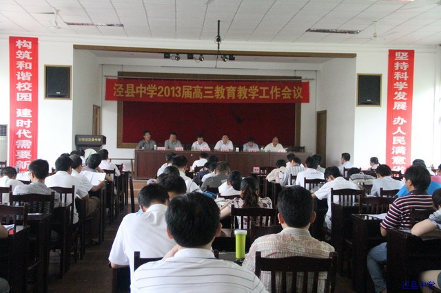 2013届高三年级组长、教导处副主任杨银宝通报了《2012—2013学年泾县中学高三年级组工作计划》和《2013届高三复习教学计划实施意见》。2012届高三年级组长、教导处副主任程永举介绍了2012届高三教育教学方面的成功经验,为2013届高三提供借鉴。唐校长指出高三的教学应进一步统一认识,科学谋划,加强领导,充分发挥年级组、班主任和教师的力量,为打好2013高考这场硬仗做准备。
