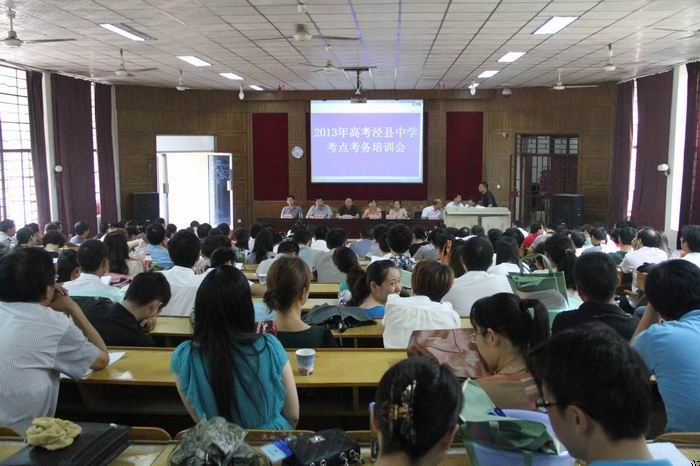 2013年普通高考泾县中学考点主考、泾县中学副校长唐述华利用多媒体课件的形式在会上就考场布置、考试管理、岗位职责、考生须知、答题须知和工作纪律、要求等方面向广大监考教师和工作人员做了考务培训,要求全体人员提高认识、严格程序、认真细致、规范操作,力争做到各项工作的零失误。泾县教体局招生办主任翟耀南在会上分别就高考有关文件和考务工作做了学习和安排。