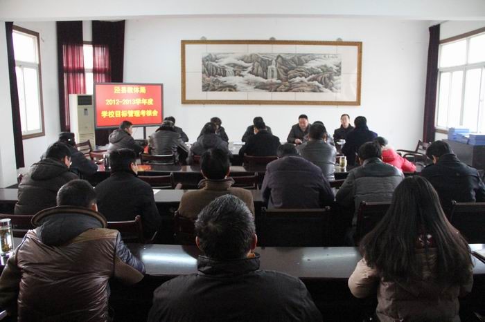12月19日下午,县教体工委副书记、副局长施朝阳一行四人来188金宝博唯一官网_wap.sports918.com开展2012-2013年度学校目标管理考核工作。188金宝博唯一官网_wap.sports918.com全体行政干部及部分教师参加本次会议。会议由校长李直斌主持。