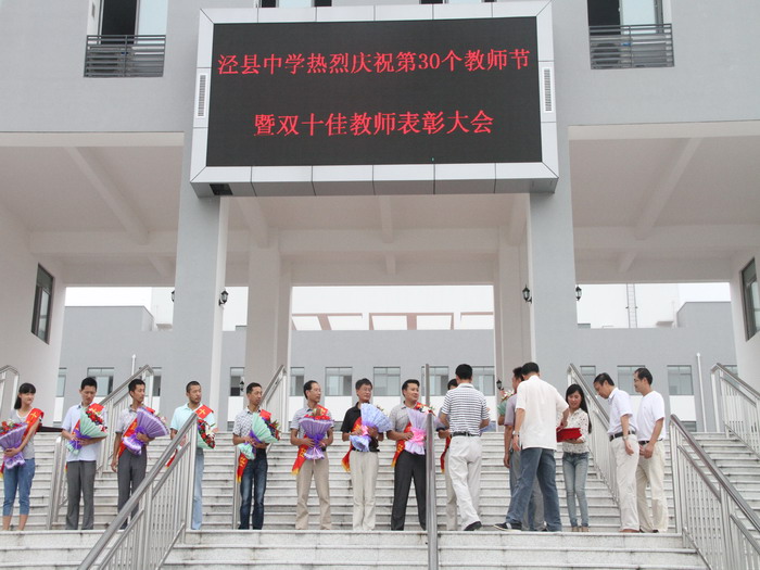 校领导班子为荣获“十佳教师”称号的杜夏荣、苏喜娟、 胡梅红、程敏娟、卫萍、潘家媛、唐海玲、胡平、汪银花、董红卫十位教师和荣获“十佳班主任”称号的洪帮、潘晖、陈知军、张学龙、陈强、杨立新、洪汝龙、王炜、蔡七林、徐学义十位班主任颁奖;学生代表和教师代表先后发言。