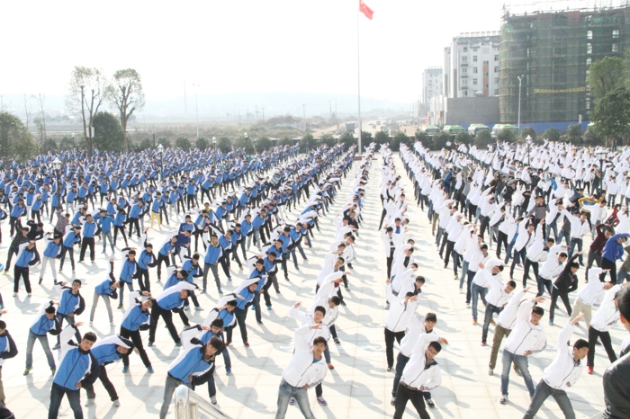 随着课间操铃声的响起,各班同学身穿校服在班主任和体育委员的组织带领下来到校园广场,伴随着第九套广播体操的音乐节奏,做起了广播操。之后,副校长佘超俊对做操动作等细节作了点评和指导,要求同学们力求动作规范,整齐划一,将广播体操的力与美完美结合,充分展现当代青少年昂扬向上的精神风貌。