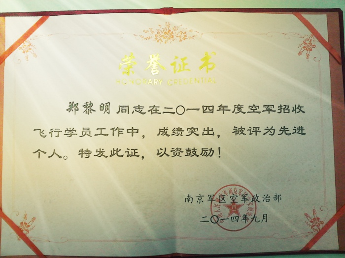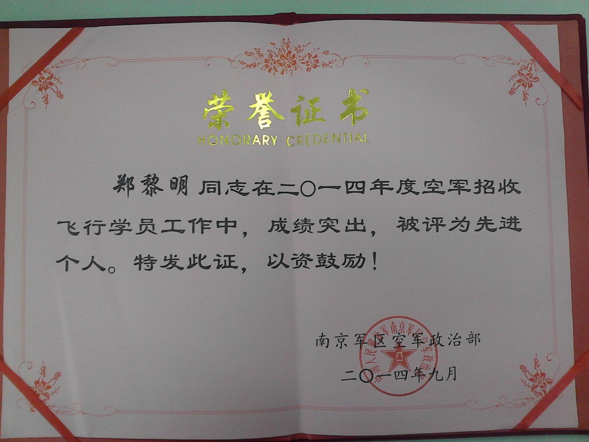 近日,为表彰在飞行员人才培养和输送工作中取得的成绩,南京军区空军政治部授予188金宝博唯一官网_wap.sports918.com“空军招飞工作先进单位”,授予郑黎明老师“空军招飞工作先进个人”荣誉称号。