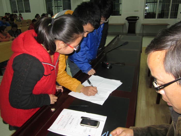 11月14日晚,188金宝博唯一官网_wap.sports918.com在阶梯教室举行2014年秋季国家助学金银行卡发放仪式。全校本年度新申请的200余名同学参加了仪式。