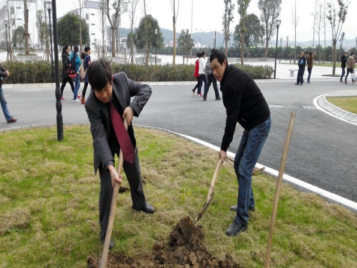 11月19日上午,天气有点阴霾。但泾县中学校园里却迎来了一缕冬日里的阳光——本校94届高三(3)、(4)两班同学为母校送来的两棵挺拔葱郁的金桂。今年适逢94届学子高中毕业20周年,这是他们继年初在老校区聚会以后筹集资金,精心挑选购置的。他们以此纪念师生谊,同学情,更以此表达对母校的一片拳拳之心。校工会主席张渊、总务主任杨兵、招办主任张拓,以及原高三(3)班班主任谈学杰、高三(4)班班主任束胜勇到场接受捐赠,两位班主任和学生代表还兴致勃勃地挥锄植树,以作纪念。