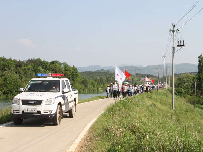 1000余名师生组成的双人纵队绵延数百米,一路上,队伍严整,彩旗高扬,口号嘹亮,洋溢着青春的朝气和激情,成为四月泾川一道靓丽而独特的风景。远足途中,高三师生们步伐坚定,斗志昂扬,在享受大自然美景的同时也经历着意志的磨炼:有的同学脚底磨起了水泡,有的同学体力透支,有的同学头晕呕吐……但他们凭借顽强的毅力,互相帮助,在随队行政联系干部、班主任和课任老师的鼓励下,咬紧牙关,坚持走完全程,胜利返回学校。
