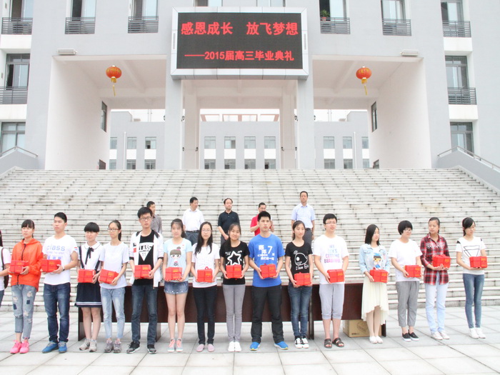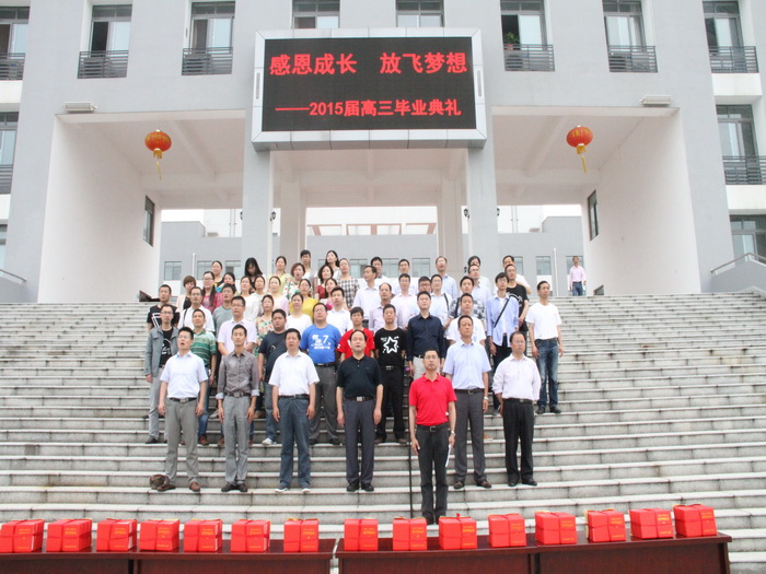 毕业典礼在轻缓柔和却又感情饱满的“感恩的心”的歌声中拉开序幕。典礼上举行了庄严的“升国旗、唱国歌”仪式,全体领导、师生向国旗行注目礼,齐唱国歌。随后,2015届高三学生代表和教师代表分别发言。三年的朝夕相处,三年的师生情谊,一千多个日日夜夜的共同奋斗,愿此时此刻用无尽的欢乐,幸福的泪水感恩母校,感谢有“你”,继续发扬母校光荣传统,为母校增辉添彩。
