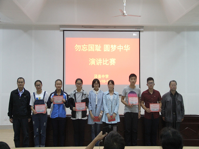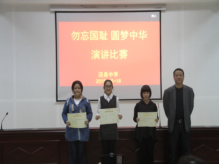 经过激烈的角逐,高一(18)班的董欣然同学以9.60的高分获得第一名。此次演讲比赛,不仅弘扬了我国的民族精神,更体现了泾中学子自强不息,励志奋斗的态度。中华民族经历过压迫与战争的洗礼,如今,我们有自信让世界瞩目,让历史惊叹。知耻而后勇,“勿忘国耻”的泾中学子将是新世纪“圆梦中华”的领头人。