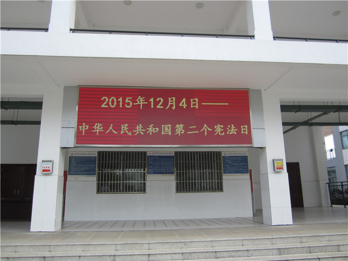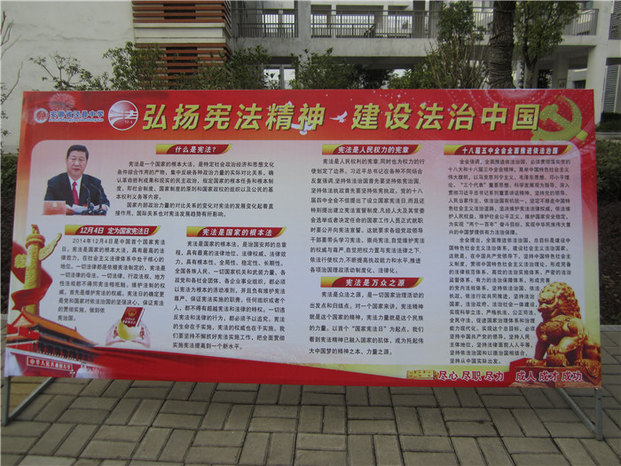 2015年12月4日,是我国第二个国家宪法日。为扎实推进宪法教育、弘扬宪法精神,提高188金宝博唯一官网_wap.sports918.com师生对宪法的认识和法治意识,更好地发挥法治宣传教育在推进依法治教、依法治校,促进全民守法等方面的作用,188金宝博唯一官网_wap.sports918.com紧密围绕“弘扬宪法精神,建设法治校园”主题,积极开展“国家宪法日”宣传教育活动。学校利用电子屏循环播放“宏扬宪法精神,建设和谐校园”和“法治护安全,宪法是根基”等宣传标语,制作宣传展板,详细介绍宪法日由来和宪法主要内容等相关知识。