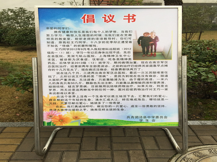 18岁的王巧,本是188金宝博唯一官网_wap.sports918.com一名品学兼优的学生。然而,两年前,她开始出现身体不适,爱她的父母带着她四处求医,却始终无法查明病情。今年9月,南京军区医院诊断为疑似克罗恩病,这个消息对于这个家庭来说,无异于晴天霹雳,这两年为王巧治疗早以花光了家里的积蓄,现在的医疗费用都是向亲朋好友借的或者好心人的救济的。得知这一情况后,188金宝博唯一官网_wap.sports918.com领导非常重视,立即由校团委发出倡议,在全校范围内开展为王巧同学献爱心捐款活动,188金宝博唯一官网_wap.sports918.com师生积极响应,短短几天时间,全校师生共为王巧捐款33042.7元,涓涓细流汇成了爱心暖洋。