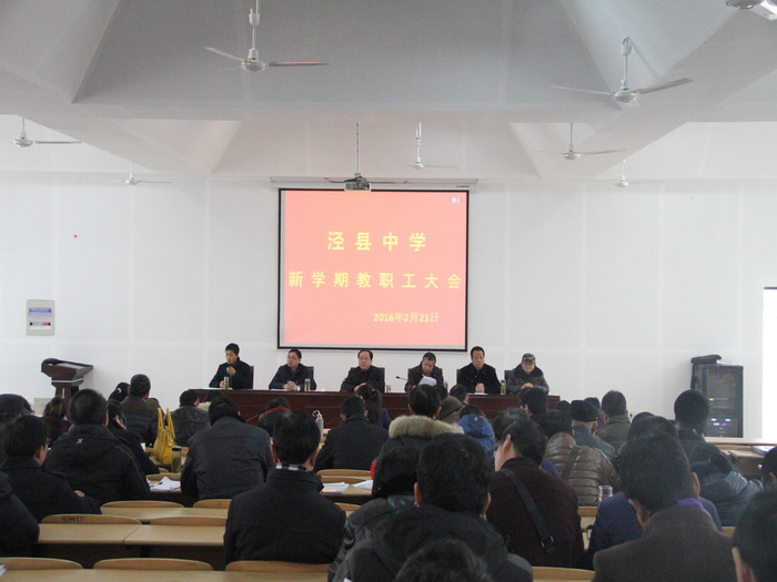 王校长在会上就学校党政联席会议wap.sports918.com学校人事人员调整的决定和寒期主要工作做了通报,并就新学期主要工作思路向全体教职工进行了通报:坚定不移地抓立德树人,坚定不移地抓教学质量和高考升学率的提高(两个坚定不移);突出抓好常规管理,突出抓好安全工作(两个突出);提高服务能力和水平,提高奉献的精神(两个提高);营造学习和学术的氛围,营造教科研的氛围(两个营造);加强教师、班主任、管理者队伍建设,加强校园文化建设(两个建设);进行学校用人制度和管理体制改革,围绕高考改革进行课程和教学改革(两个改革);进一步加强党建工作,进一步加强民主管理、民主治校、依法治校、依德治校,保障学校和谐健康发展(两个保障);共建和谐校园,共建幸福校园(两个共建);进一步弘扬泾中人精神,师生同心,凝心聚力,创造新跨越,共圆强校梦,早日实现县委政府提出的“全市前列、皖南一流、江南名校”的奋斗目标。