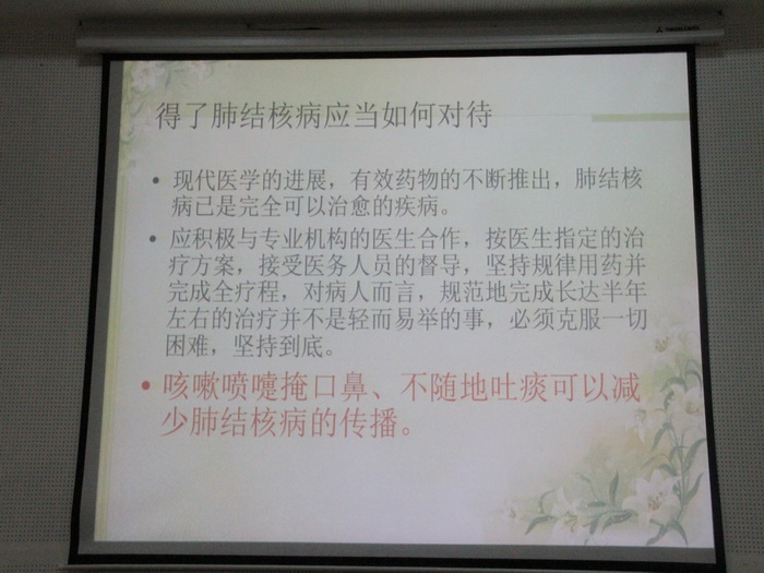 县疾控中心结核病防治科陈界云科长首先带领师生们共同观看了由卫生部制作的防治结核病公益宣传大片《功夫结核》,以广大师生喜闻乐见的形式呼吁广大师生注意个人卫生,关注结核病的防治工作。讲座中,陈科长就什么是结核病、结核病的传播途径和临床表现、学校结核病疫情及特点、学校开展结核病防治工作的重要性及如何做好学校结核病防治工作等问题做了详细的讲解,同时宣传了国家免费治疗肺结核的政策。最后的结核病防治知识有奖竞猜活动将讲座推向高潮,引起师生强烈共鸣。