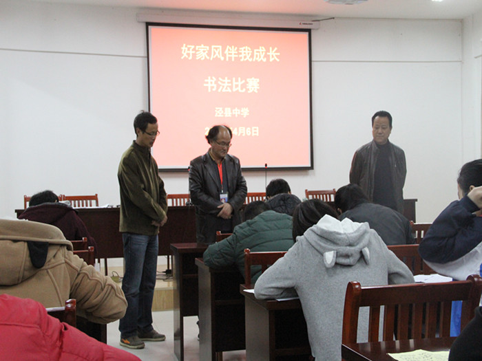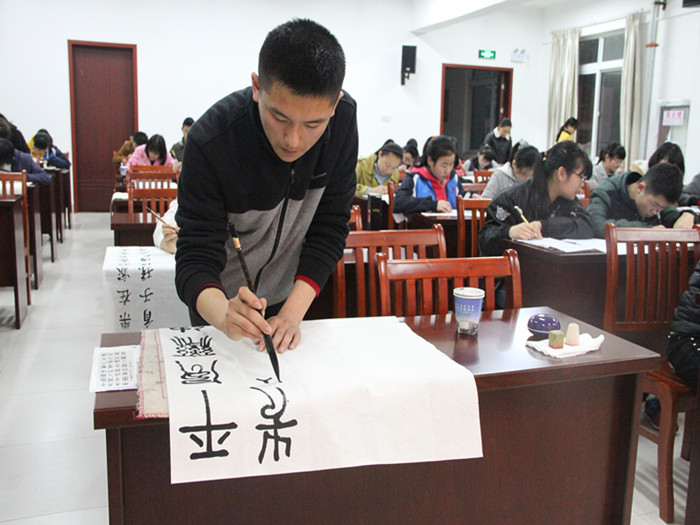 4月6日晚,188金宝博唯一官网_wap.sports918.com首届校园文化体育艺术节书法大赛在行政楼南楼302室举行。本次现场书法比赛由校团委负责主持,副校长佘超俊,安徽省书法家协会会员、校工会主席张渊,政教处主任黄新平亲临比赛现场观摩指导,各班经过选拔的近50名同学参加本次书法比赛。