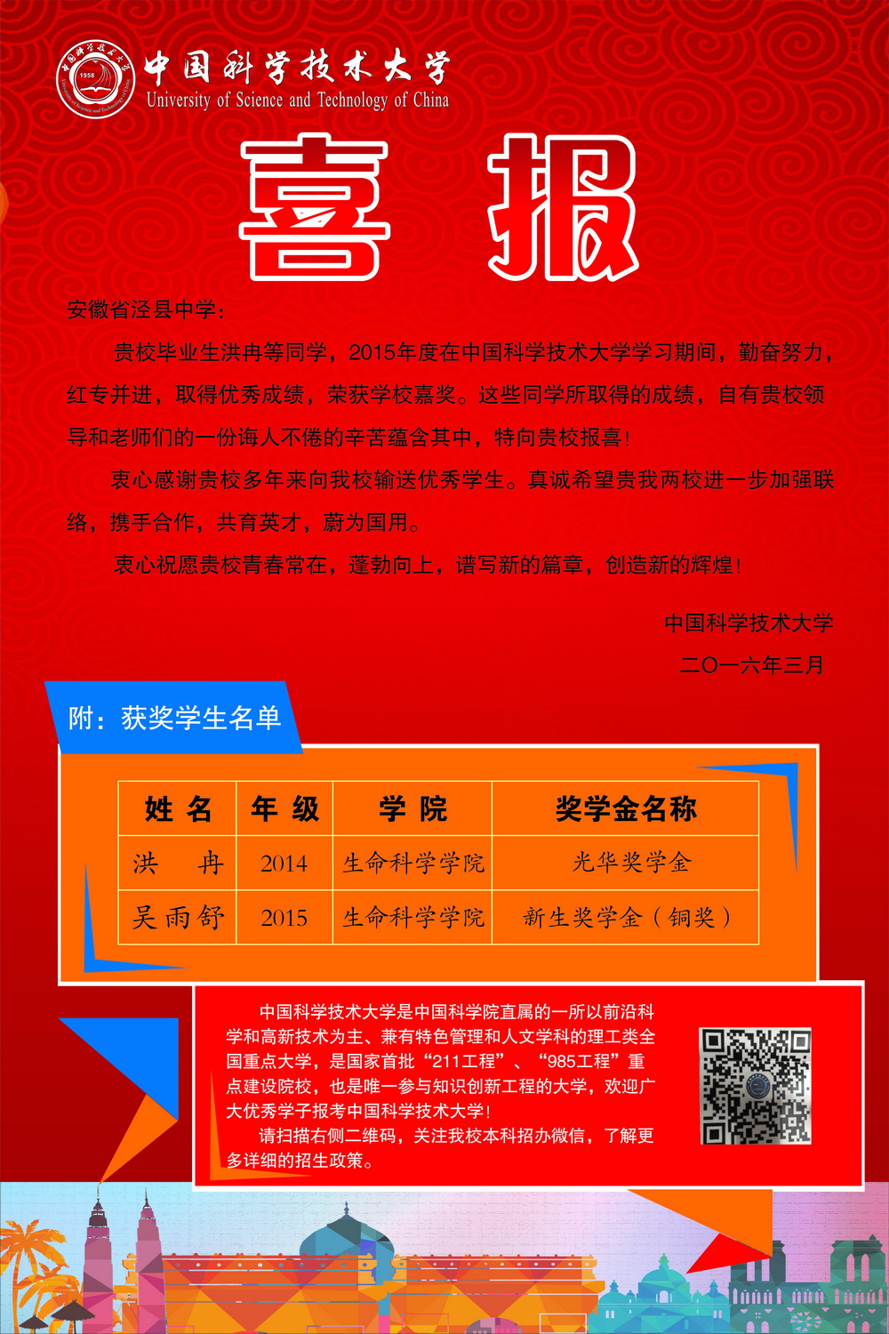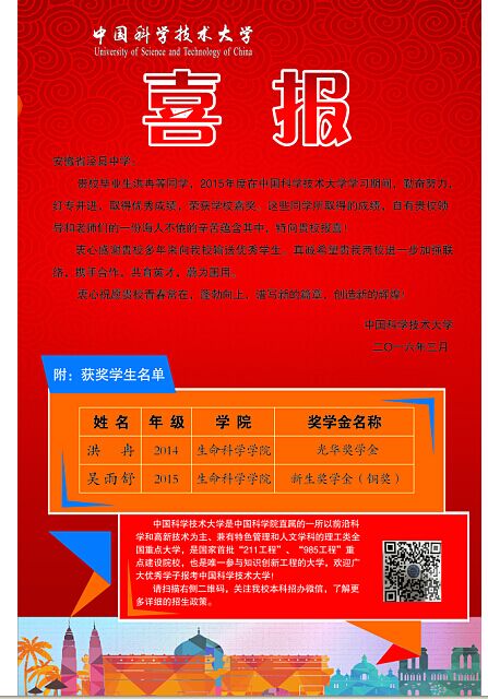 日前,从中国科学技术大学传来喜讯,188金宝博唯一官网_wap.sports918.com就读中国科学技术大学生命科学学院的2014届优秀毕业生洪冉同学和2015届优秀毕业生吴雨舒同学,在校期间,勤奋努力,红专并进,取得了优异成绩,分别荣获该校光华奖学金和新生奖学金。