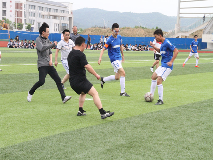 比赛场上,双方队员积极踊跃,气氛热烈融洽,有带球过人的灵巧,中场指挥的从容,门前抢点的敏锐,也有错失良机的懊恼,脚下拌蒜的踉跄。双方队员精湛的脚法、犀利的射门以及精彩的配合博得在场观赛师生们的阵阵喝彩。最终,师生间的陌生在场上已荡然无存,有的只是激情的汗水和矫健的身姿,还有师生间的浓情厚谊。
