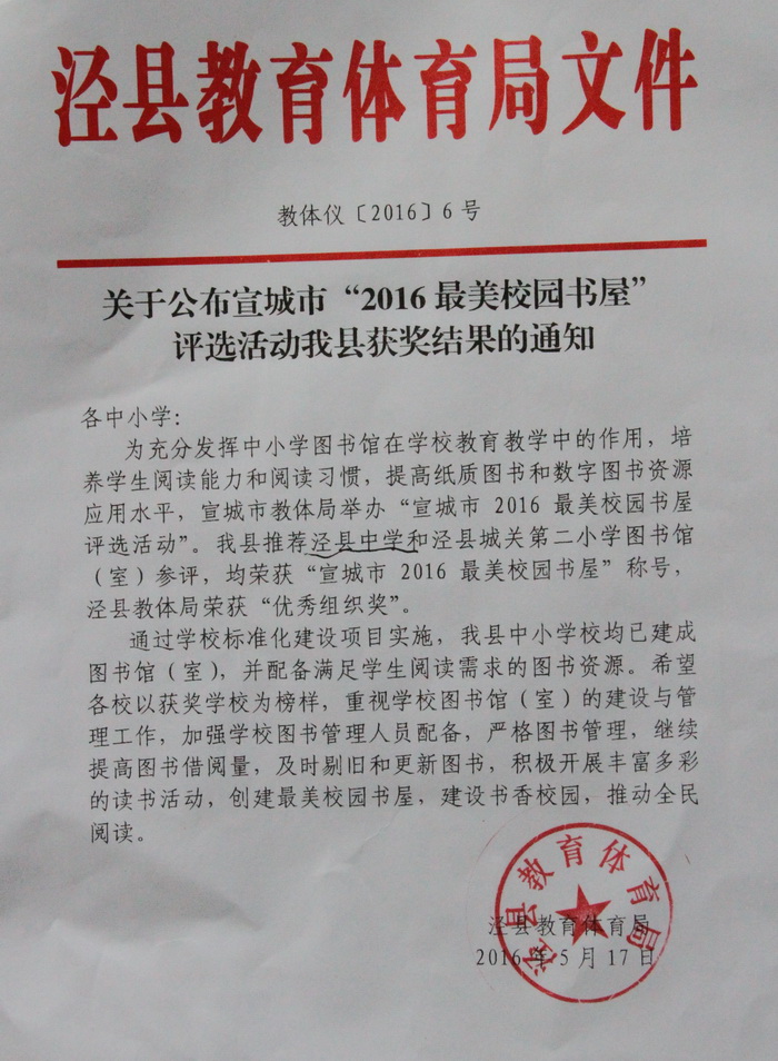 近日,传来喜讯,在宣城市教体局举办的“宣城市2016最美校园书屋” 评选活动中,188金宝博唯一官网_wap.sports918.com荣膺“宣城市2016最美校园书屋”称号。