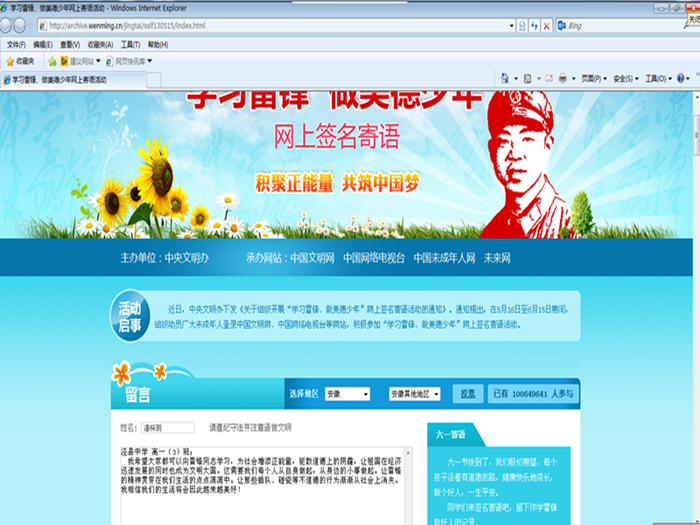 为落实“我的中国梦”主题教育,进一步深化“做一个有道德的人”主题活动,根据县教体局相关文件精神,校团委积极开展了“学习雷锋、做美德少年”网上签名寄语活动。