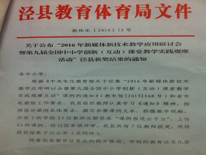 近日,在中央电教馆举办的2016年新媒体新技术教学应用研讨会暨第九届全国中小学创新(互动)课堂教学实践观摩活动中,188金宝博唯一官网_wap.sports918.com三节课例在此项活动中喜获大奖。