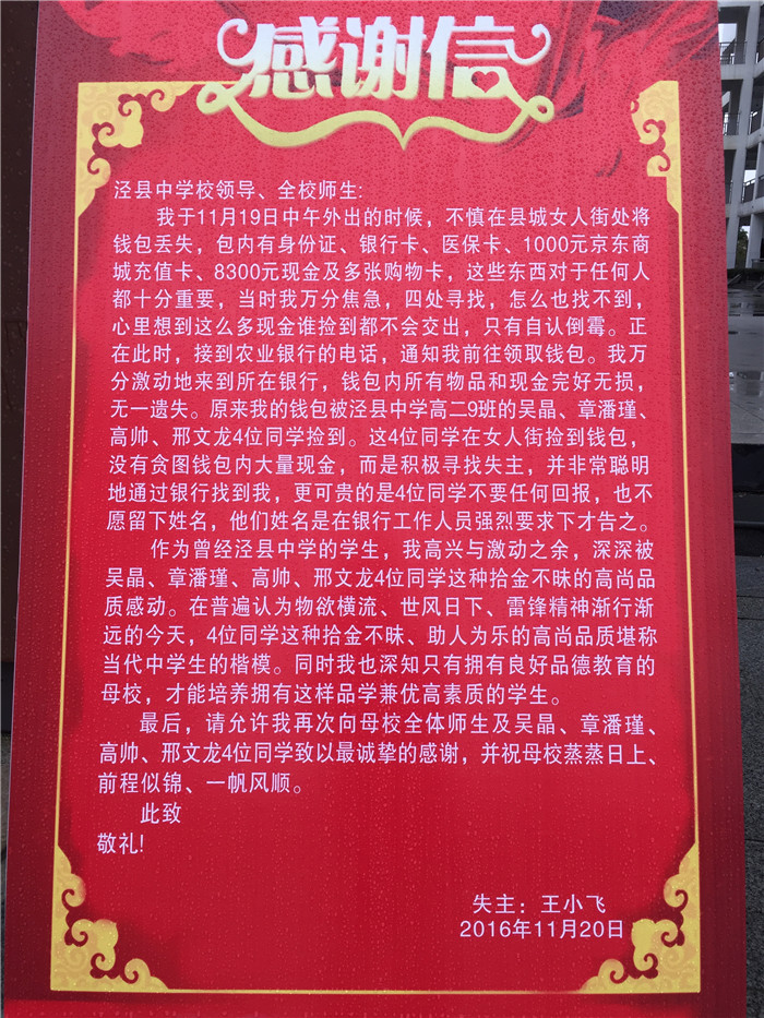 那一刻,四位同学俯下身去拾起的是中华民族的传统美德,送还的是一颗至纯至美的心,他们用实际行动践行了社会主义核心价值观,其拾金不昧的行为充分体现了泾中学子高尚的道德情操和高度的社会责任感。