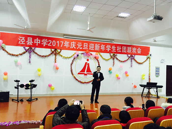 同学们用气球、彩带将活动现场装扮一新,烘托出浓浓的节日和新年气氛。晚会在音乐社颇有名气的男生组合歌舞《call me baby donnot cry》中热闹开场,激情四射的歌舞,点燃全场热情,展现靓丽青春;由小记者团创作的配乐诗朗诵《再别康桥》带领同学们走进另一番文艺世界,演员们复古的服装、深情的诵吟,让人沉静在诗的海洋;颇具实力的男声独唱《练习》让人以为偶像刘德华亲临现场!爵士鼓钢琴伴唱《sing me to sleep》掀起全场高潮,展现摇滚与高雅的混搭魅力;在青春律动的串烧歌曲中,晚会圆满落下了帷幕。
