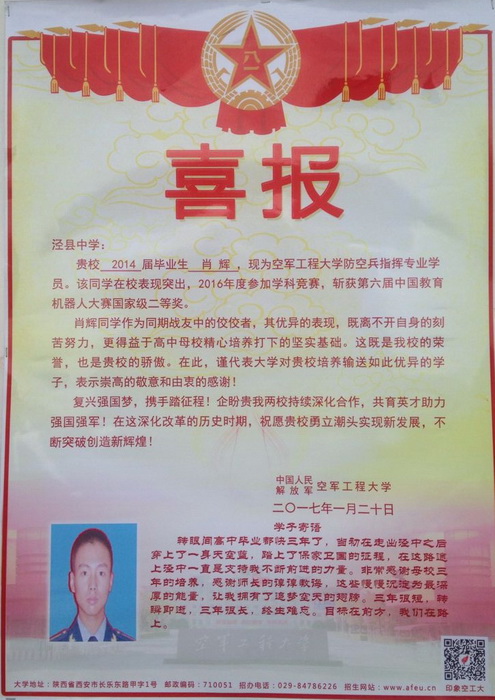 希望全体同学以他为榜样,努力学习,争取取得更大更好的成绩,为校争光,争做泾中人的骄傲!