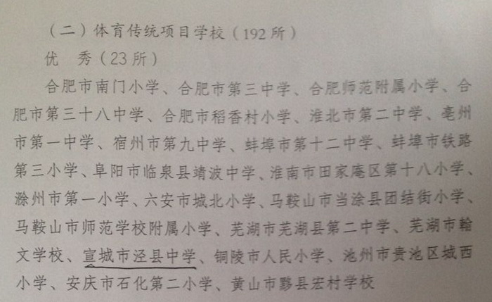 根据《安徽省体育局、安徽省教育厅wap.sports918.com开展2016年度省级体育专项特色学校和体育传统项目学校考核工作的通知》要求,对全省的体育专项特色学校和体育传统项目学校进行了严格考核。近日,安徽省体育局、安徽省教育厅联合发文,通报了2016年度安徽省省级体育专项特色学校、体育传统项目学校考核情况,188金宝博唯一官网_wap.sports918.com喜获“2016年度省级体育传统项目学校”优秀等次。全省共有23个体育传统项目学校获优秀等次,宣城市仅有泾县中学获此殊荣。
