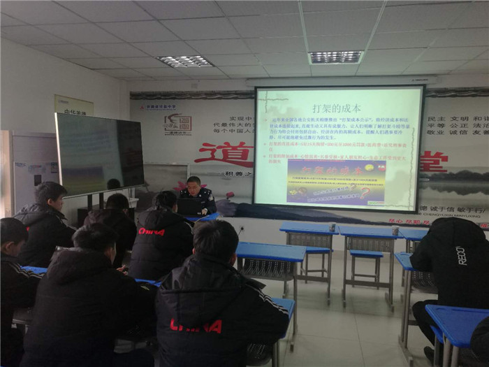 为进一步巩固12月法制宣传教育月的教育成果,使学生从思想上牢固树立法制观念,培养学生知法守法的法律意识,教育学生如何远离违法犯罪,12月20日下午,188金宝博唯一官网_wap.sports918.com联合泾川派出所共同开展了一次法制教育道德讲堂活动,部分学生代表现场聆听了讲座。活动由政教处主任方利军主持,泾川派出所翟晓林副所长携两名公安民警受邀来校作专题讲座。