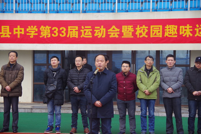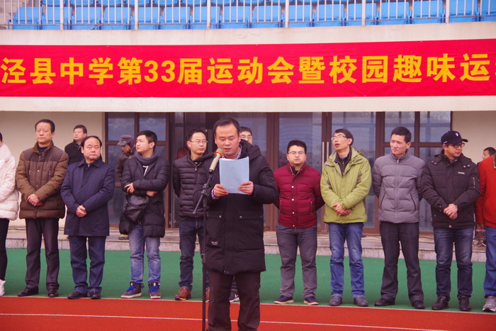 开幕式在庄严的国歌声中拉开帷幕,副校长杨银宝主持开幕式。副校长佘超俊致开幕词,总裁判长刘忠平宣读比赛事项并提出要求。县人大常委会副主任,校党委书记、校长王永生郑重宣布“泾县中学第33届运动会暨校园趣味运动会开赛!”