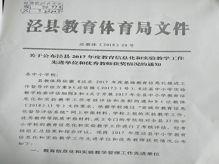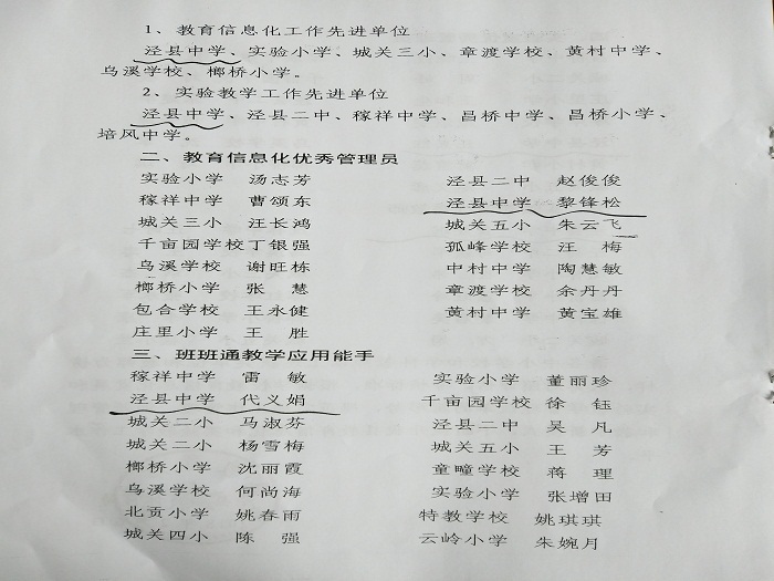 依据《泾县2017年度基础教育信息化推进工作督导评估方案》和《wap.sports918.com开展2017年全县中小学教育信息化和实验教学工作考核评估和表彰的通知》等文件要求,188金宝博唯一官网_wap.sports918.com教育信息化管理中心根据学校工作安排,通过“宣城市教育信息化督导评估系统”进行材料收集、整理并进行网上申报工作,最终通过考核评估并取得优异的成绩,188金宝博唯一官网_wap.sports918.com再次荣获县“教育信息化工作先进单位”殊荣,其中黎锋松老师荣获“教育信息化优秀管理员”、代义娟老师荣获“班班通教学应用能手”荣誉称号。