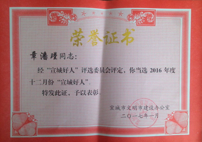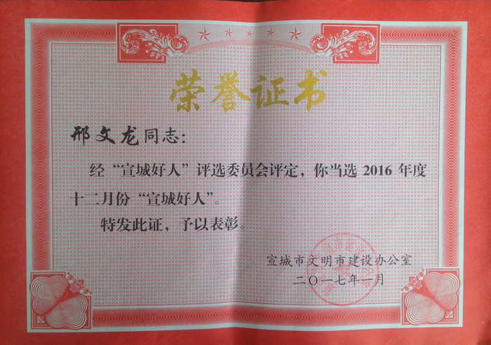 经市“宣城好人”评选委员会评定,188金宝博唯一官网_wap.sports918.com吴晶、章潘瑾、高帅、邢文龙四位同学当选2016年12月份“宣城好人”。