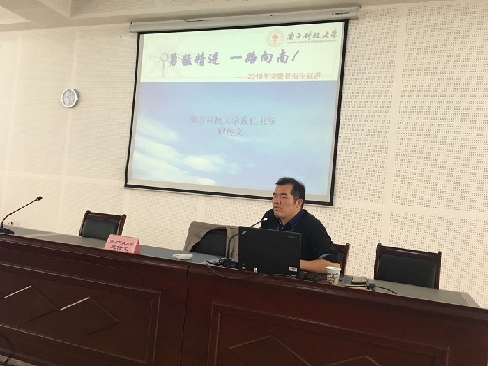 鲍院长首先通过一段视频使同学们对南科大有了一定的感性认识,随后结合幻灯片对南科大的建校理念、办学模式、发展方向、师资队伍建设、人才培养模式、招生方式等进行了介绍,欢迎同学们报考南科大。学者的风范、亲和的形象,精彩的报告,给与会师生留下深刻印象,赢得阵阵掌声。