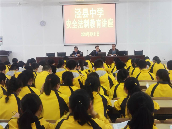 为加强安全法制宣传教育,增强学生的安全意识和法制观念,4月11日下午,县公安局国保大队、泾川派出所民警一行4人来到188金宝博唯一官网_wap.sports918.com开展安全法制教育讲座,高一年级近200名学生代表聆听了讲座。讲座由政教处副主任张俊主持。