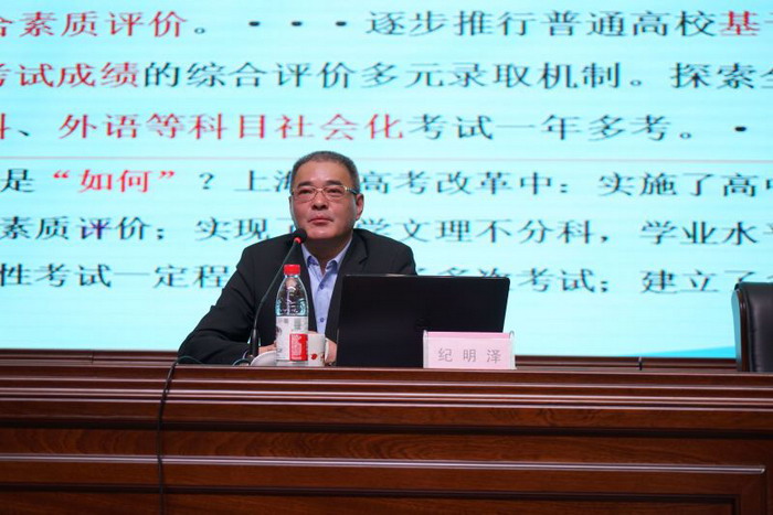 会上邀请上海市教育委员会教研室副主任、特级教师纪明泽作了《高考改革带来的高中教育新变化》专题报告。纪主任分别从高考改革背景、课程教学管理等四个方面阐述了新高考改革将给我们带来的巨大变化:学生职业规划成为教育关注的新热点;分层教学成为教学新方向;学科间均衡发展成为新挑战;学生综合素质全面发展成为评价新趋势;“走班制教学”成为新常态。整场报告历时三个小时,但条理清晰,剖析入理,给与会者开阔了眼界,指明了方向。